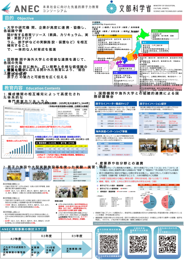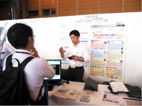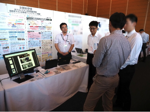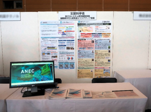 展示エリアでは、文部科学省を含め36の原子力関連企業・機関がブース出展し、研究紹介・製品紹介を行いました。当展示ブースでは、企業・研究機関・学生を対象に、「ANECの人材育成について」ショートプレゼンや関連資料の配布等を行いました。ブースには原子力学会長をはじめ、60名以上の訪問があり、ANECを知っていただく機会になりました。